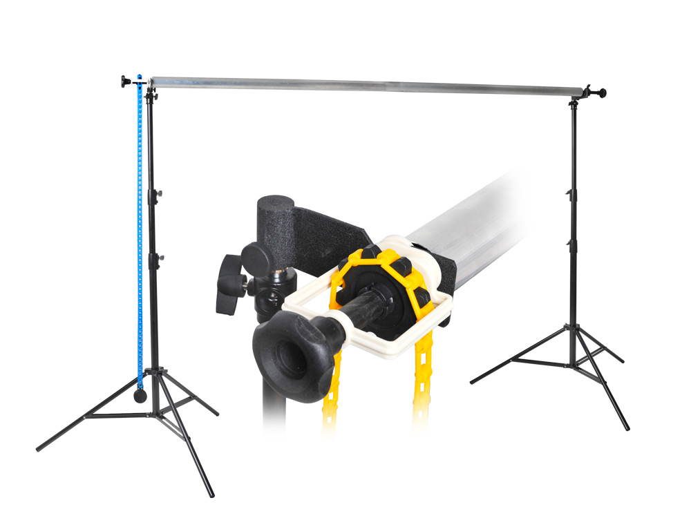 This professional background support system can be used in the studio or out on location. Specifically designed for use with paper rolls, this system comes with a crossbar made up of aluminium tubes and a roller and chain system for easy adjustment and rolling of the backdrop. Extends to a max height of 3m and disassembles in a compact set of components that can easily transported.