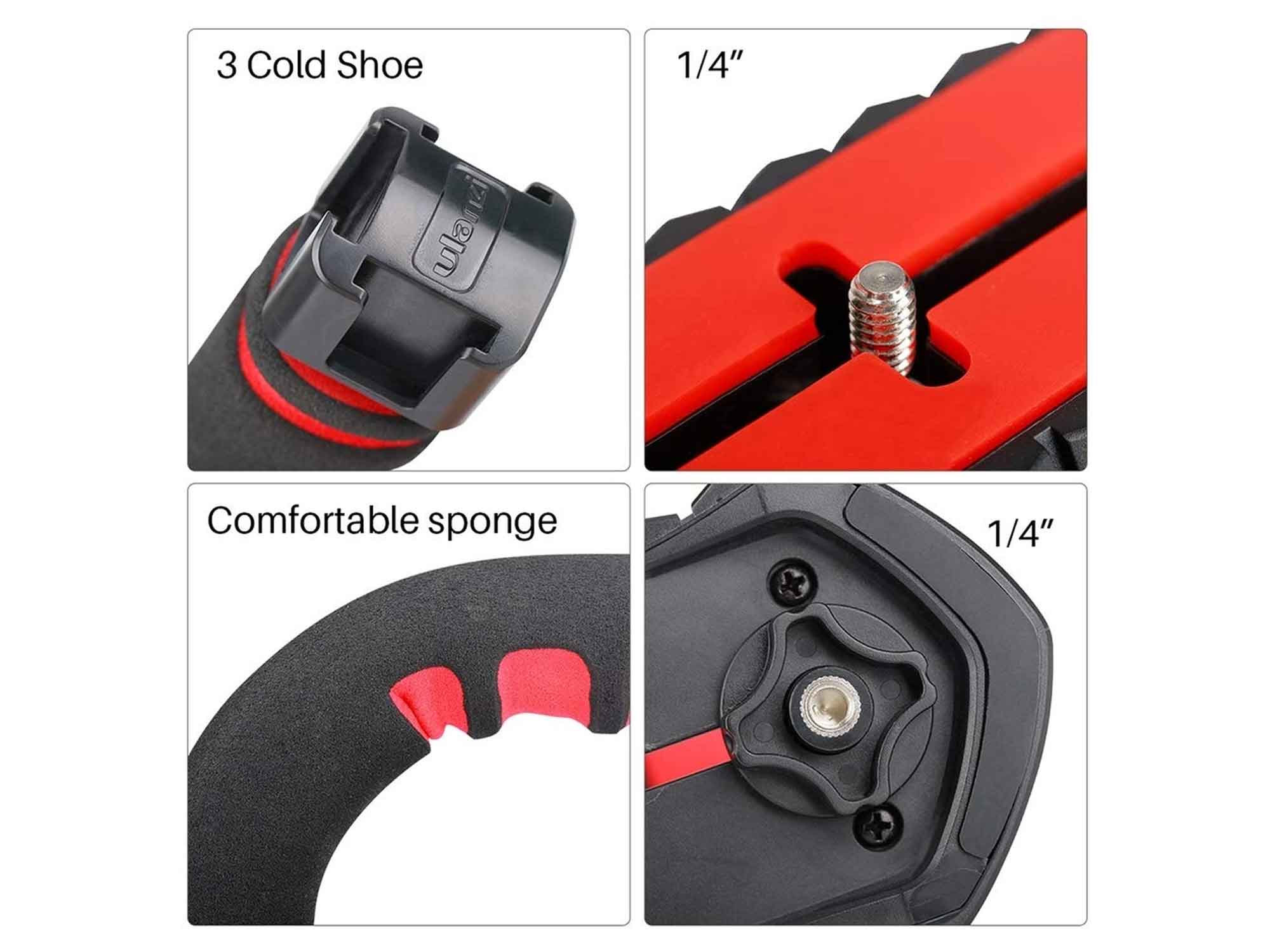 The versatile and easy to hold Ulanzi U-Grip is equipped with a triple shoe-mount on top making it possible to add an external monitor, LED video light, flashes, microphones or smartphones, etc.