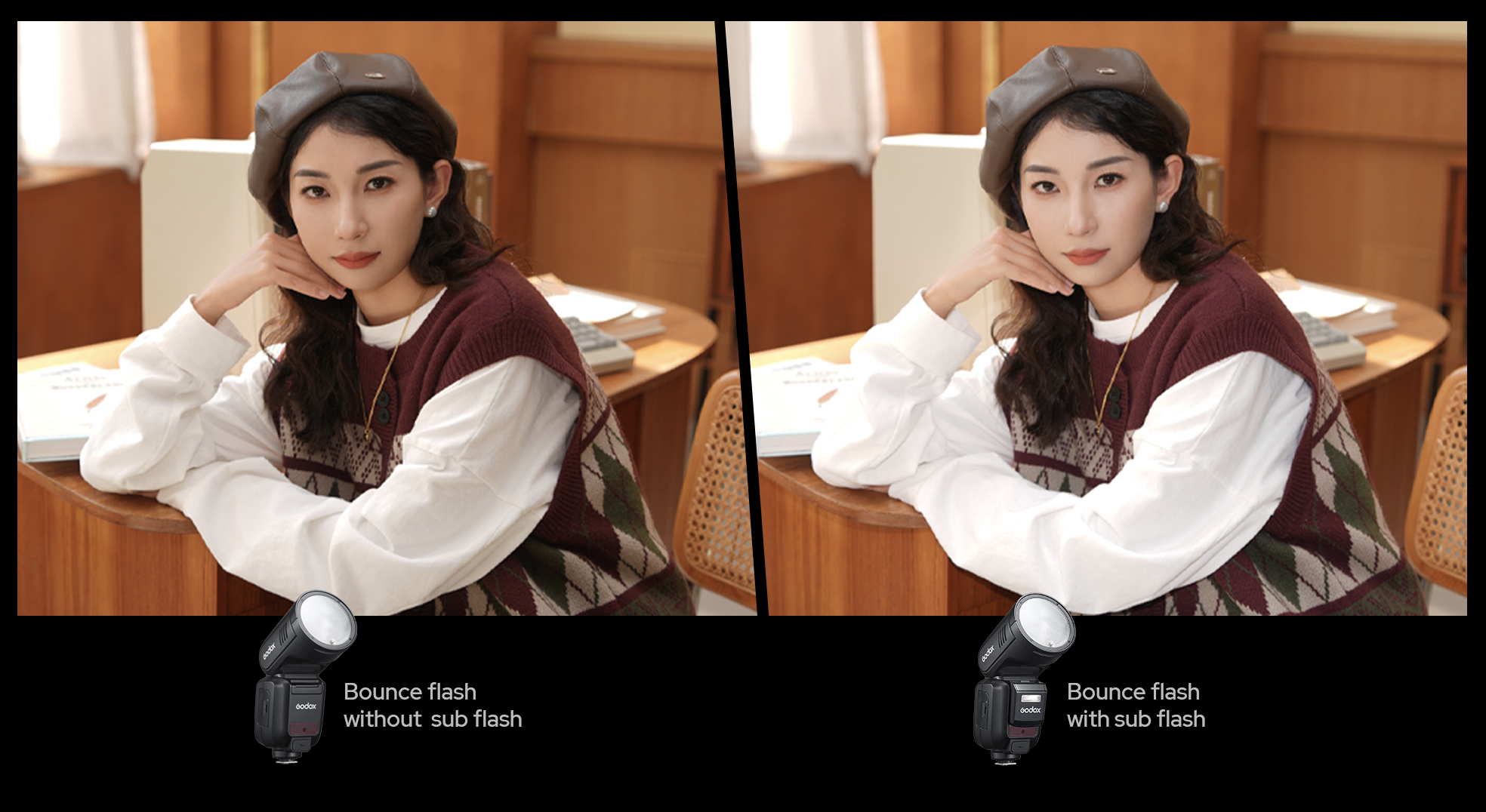 The V100 continues the highly praised detachable sub flash (SU-1) design from the V1 Pro. This versatile feature enables dual-light setups with a single flash, offering creative lighting solutions for portrait photography.