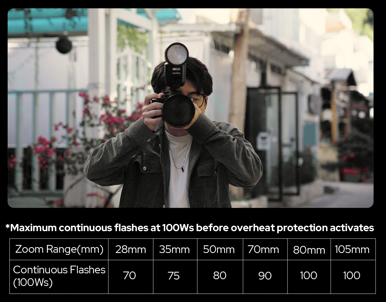 Thanks to its advanced cooling system, the V100 delivers 70 to 100 consecutive flashes at 100Ws without compromising performance. This ensures enhanced shooting efficiency and flexibility, allowing you to handle complex scenarios with ease and capture every brilliant moment of your creative vision.