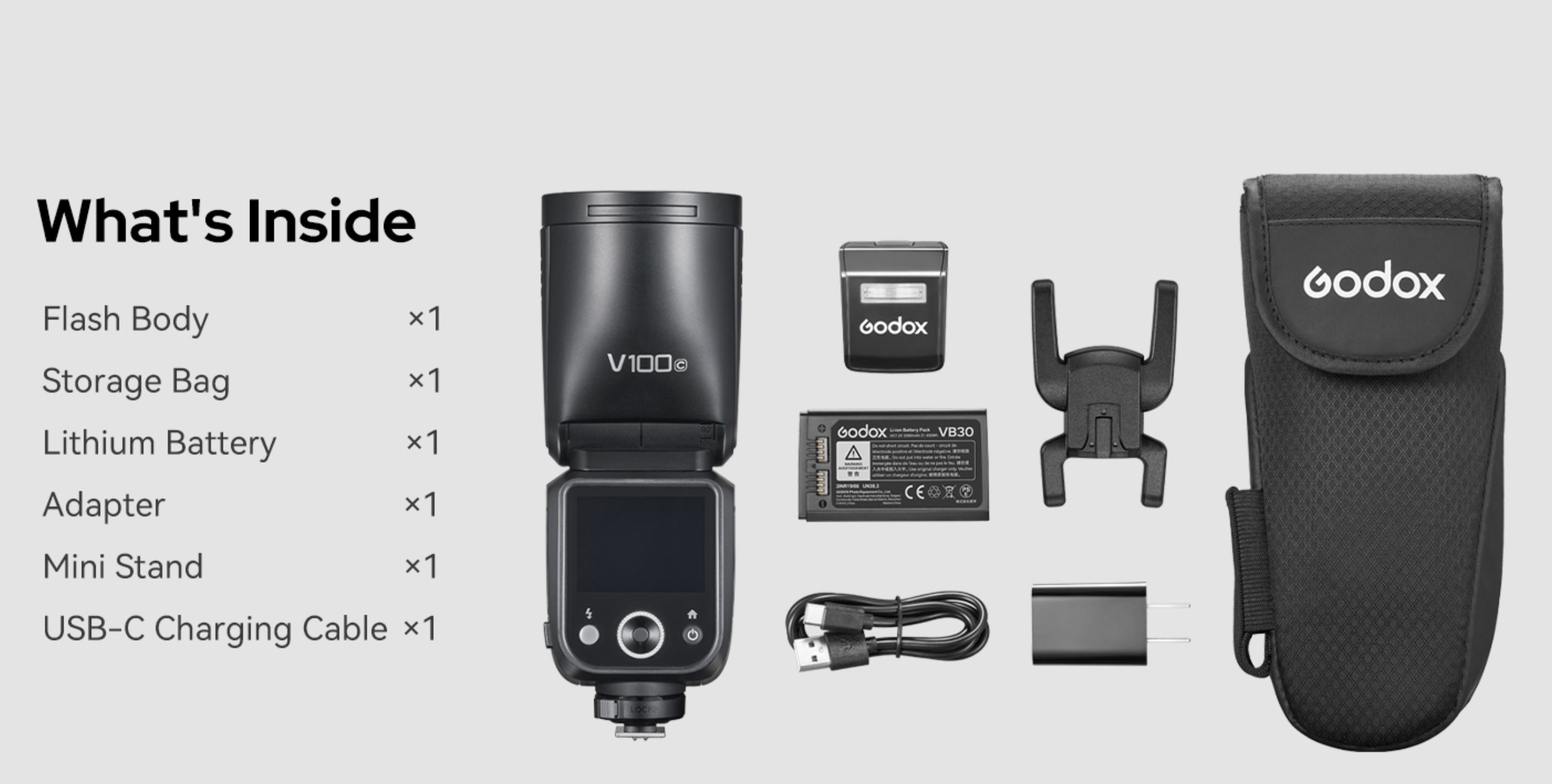 Powered by the same high-performance lithium battery as the V1 Pro, the V100 ensures uninterrupted shooting. The Type-C charging port and compatibility with the VC26T Multi-Battery Charger make recharging quick and convenient. The V100 includes a port for the PB960 Lithium-Ion Flash Power Pack, reducing full-power recycling time to as fast as 0.8 seconds. This feature supports demanding, high-intensity shooting scenarios, ensuring peak performance.